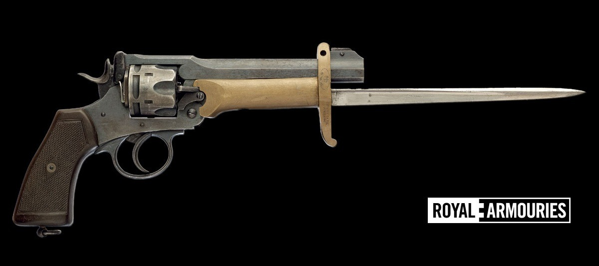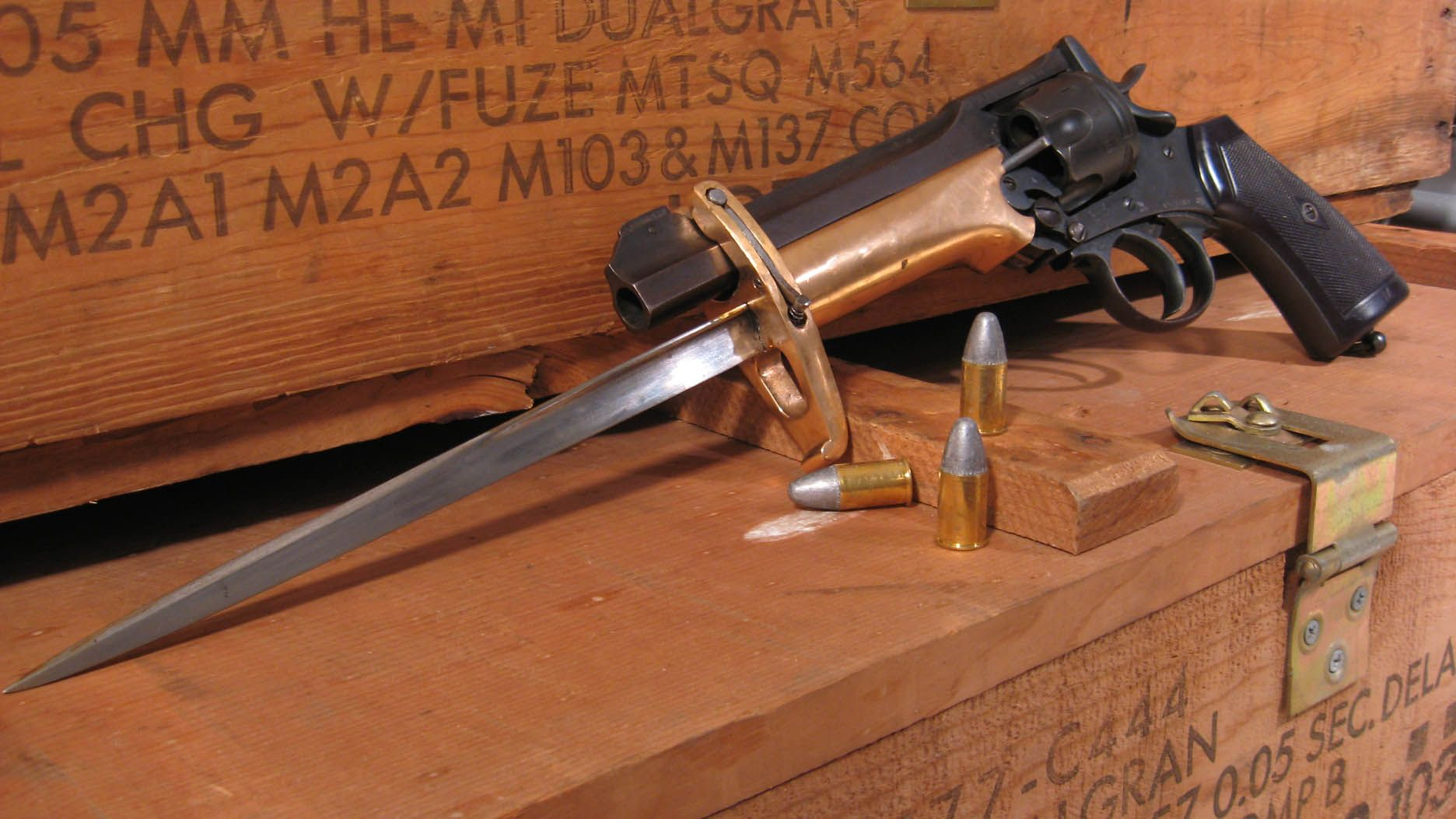 而一战时期,英军有个叫普利查克的大聪明在法国的战壕里跟德国人打得死去活来的,对左轮上弹的问题也是感同身受。这个大聪明突然灵光一闪,这左轮在战壕里面临装弹的问题,咱是不可以给它上个刺刀?