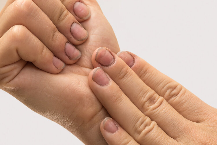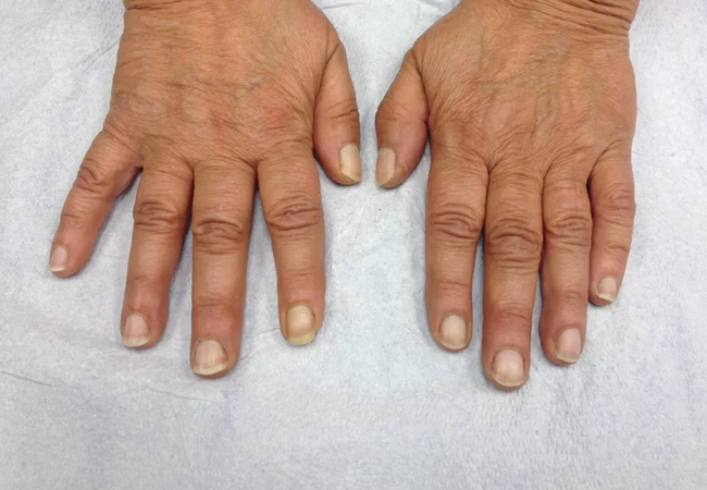 这是一名肾内科医生分享的患者手指照片,我们可以看到,患者的指甲颜色分为上下两层,白色和红色约各占一半。经过检查,这名59岁的患者患有慢性肾病,而这种“红白分层”的指甲表现正是肾病导致的。