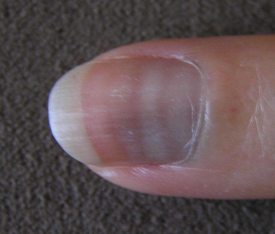 甲板上出现横向、平滑、无法触及的白线,与甲半月平行,长度与甲板的宽度差不多,无甲凹陷,这种称为米氏(Mees)线,可能是慢性肾病、终末期肾病引起,也可能是重金属中毒引起,可以通过白线的位置推测患病的时间。