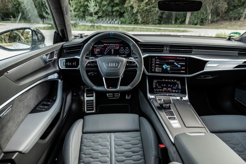 在内饰设计层面,全新奥迪RS7Sportback采取了奥迪家族化的风格设计,12.3英寸数字仪表匹配10.1英寸触摸中控屏,配合最新一代MIB3中控系统,大大提升整体设计的科技感,在中控台也保留了非常多的物理按键,并没有跟其他品牌车型一样全部集成在人机交互系统上,在这一点上是非常有利于在驾驶时候的盲操的,并且有着非常丰富其它配置,诸如Bang& olufsen高端音响、30色氛围灯、真皮方向盘等都非常亮眼。此外,前排座椅采用了翻毛皮+皮质的组合覆盖,带来出色防滑表现的同时也更显档次。而后排座椅造型也与前排座椅看齐,即使采用了轿跑造型头部余量依旧充裕,并且腿部空间也达到了相当不错的水平。