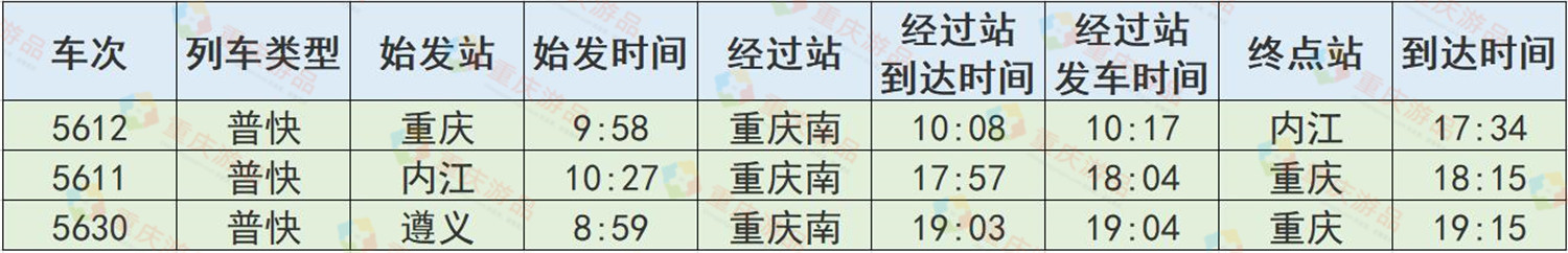 2009年,重庆南站的货运业务才停止,如今,重庆南站只有3趟列车还在运行,分别是5612次、5611次和5630次列车,具体情况如下图所示。