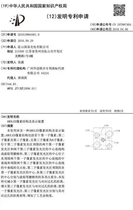 2016 年,昆山国显光电有限公司提交了一份《AMOLED 像素结构及显示装置》的发明专利申请。