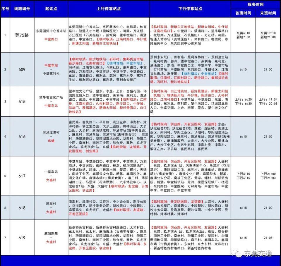 莞75路、609路、615路、616路、617路、618路、619路等7条跨市公交线路临时调整,取消停靠广州区域公交站点。