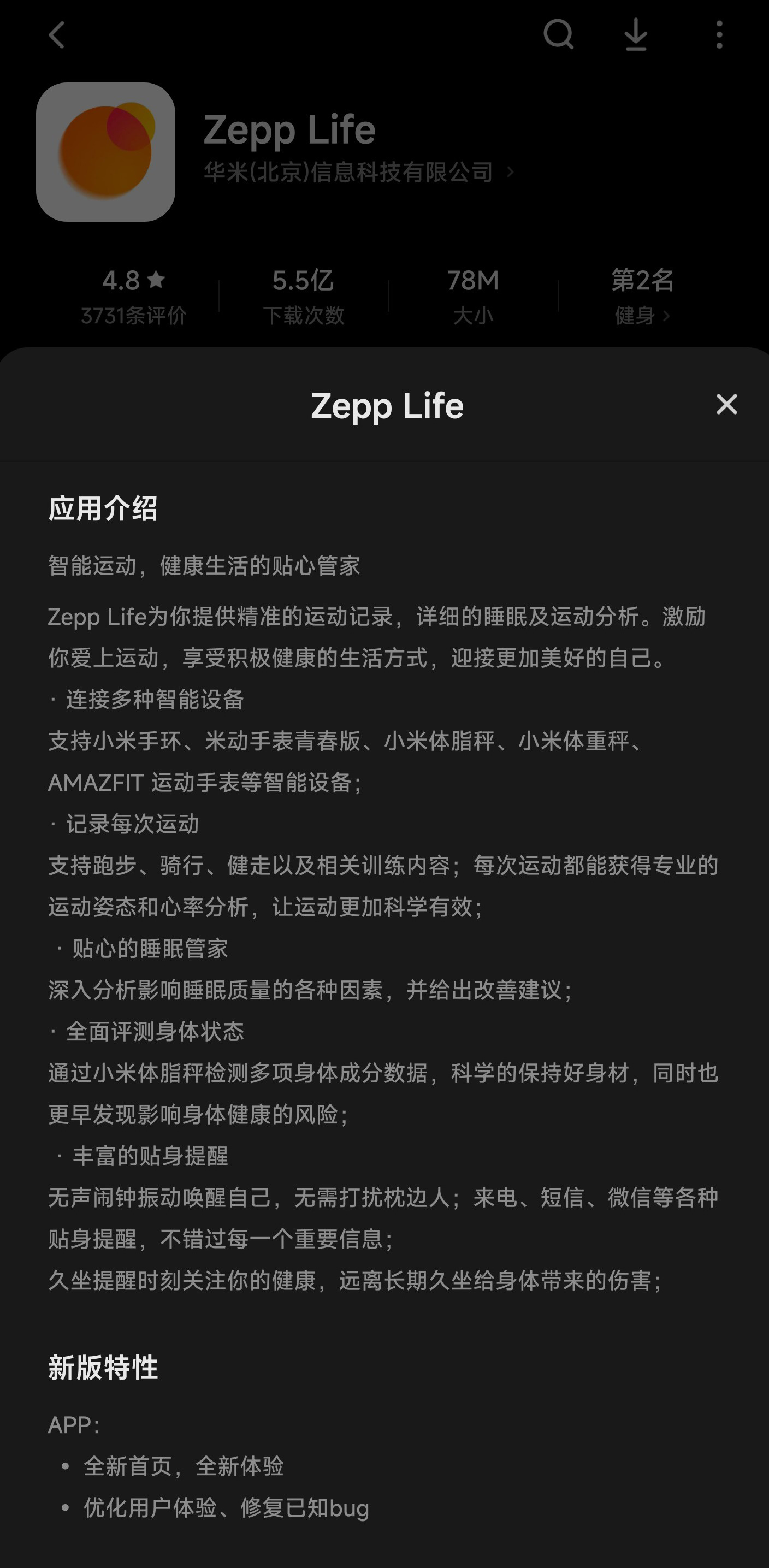 据应用介绍,Zepp Life 由华米(北京)信息科技有限公司开发,支持小米手环、米动手表青春版、小米体脂秤、小米体重秤、AMAZFIT 运动手表等智能设备。