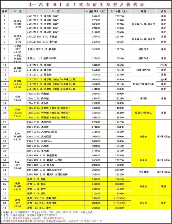日前,车友圈曝出了一份标题为“【一汽丰田】员工购车适用性车型及价格表”,表中包含亚洲龙、卡罗拉、奕泽、荣放、亚洲狮、凌放等在售车型。