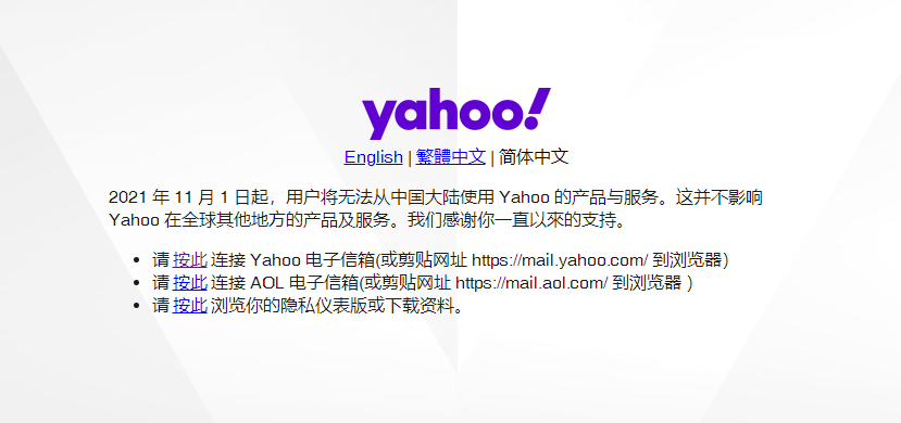 2021年11月,《华尔街日报》以“雅虎退出中国大陆,在华20年风雨历程就此画上句号”的标题撰写了雅虎宣布撤出大陆市场的消息。此后网友们发现,雅虎仅存的在中国大陆可以访问的包括天气App、新闻资讯等在线服务,以及雅虎旗下的科技媒体Engadget中文版均无法访问。