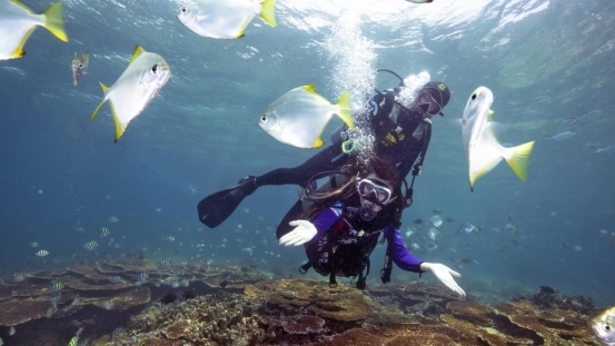 珊瑚礁潜水在“太空舱”潜点,活体珊瑚礁一簇一簇紧密相连、错落有致,形成色彩绚丽的“海底森林”,珊瑚丛中热带鱼群穿梭嬉闹,十分活泼,整个海底生机勃勃,拍照hin好看。