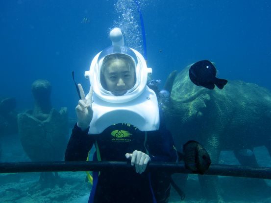 海底漫步就是网上见到的“海底宇航员”,带着头领头盔扶着扶手前行,呼吸顺畅、不脏妆容、不湿头发,能与鱼儿们平视,看它们从眼前游过。