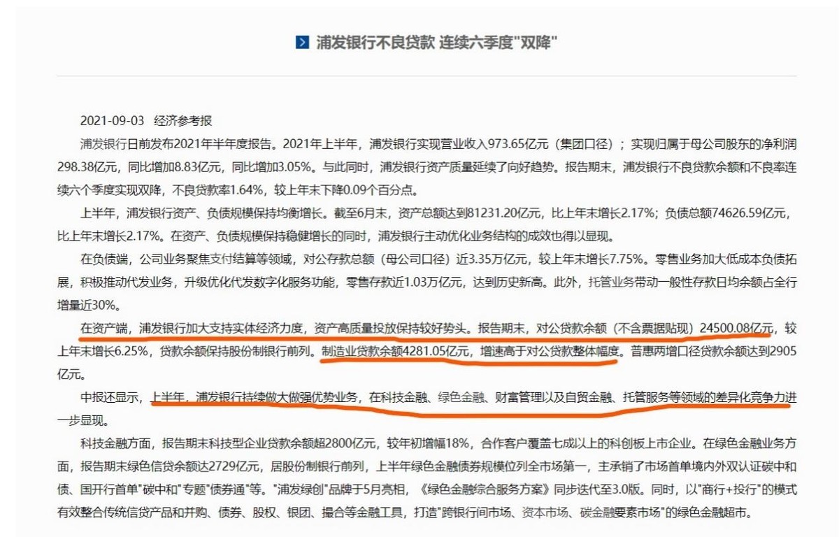 浦发银行媒体关注栏目《浦发银行不良贷款连续六季度"双降"》一文,指出了该行不良贷款减少的原因。文章内容显示,该行加大支持实体经济力度,对公贷款余额、制造业贷款余额均保持增长。除此之外,该行也在科技金融、绿色金融、财富管理、自贸金融、托管服务等领域得到一定成效。