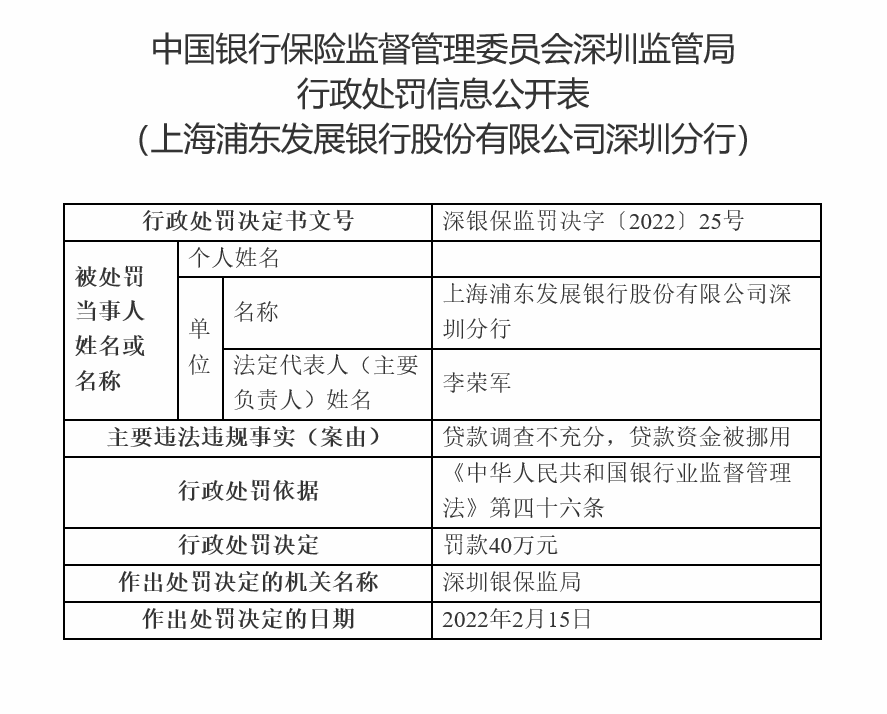 2月24日,银保监会对上海浦东发展银行深圳分行开出40万元罚单,缘于该行存在贷款调查不充分,贷款资金被挪用等违法违规行为。