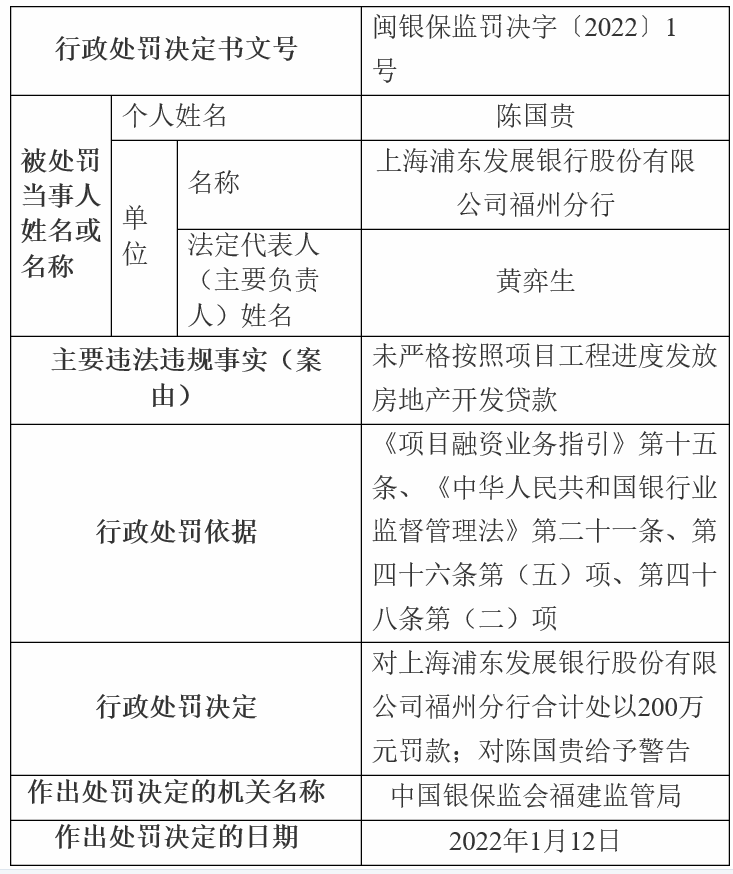 具体来看,12张罚单中,处罚金额最高达200万元。1月19日,浦发银行福州分行因未严格按照项目工程进度发放房地产开发贷款,被处200万元罚款,负责人陈国贵被予以警告处罚。