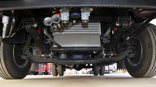 底盘部分,这款车的前桥允许载荷为1.79吨,后桥允许载荷为2.7吨,其悬架采用的是前3后5+3的形式,轮胎规格为7.50R16 8PR的轮胎,这套组合的搭配,承载能力同样不用担心,而这款车在自重方面约为2.72吨,而公告上的总质量为4.495吨,也就意味着人加物的总重在标载的前提下,上限是接近1.8吨,同样是这几款车型中装载能力最强的。