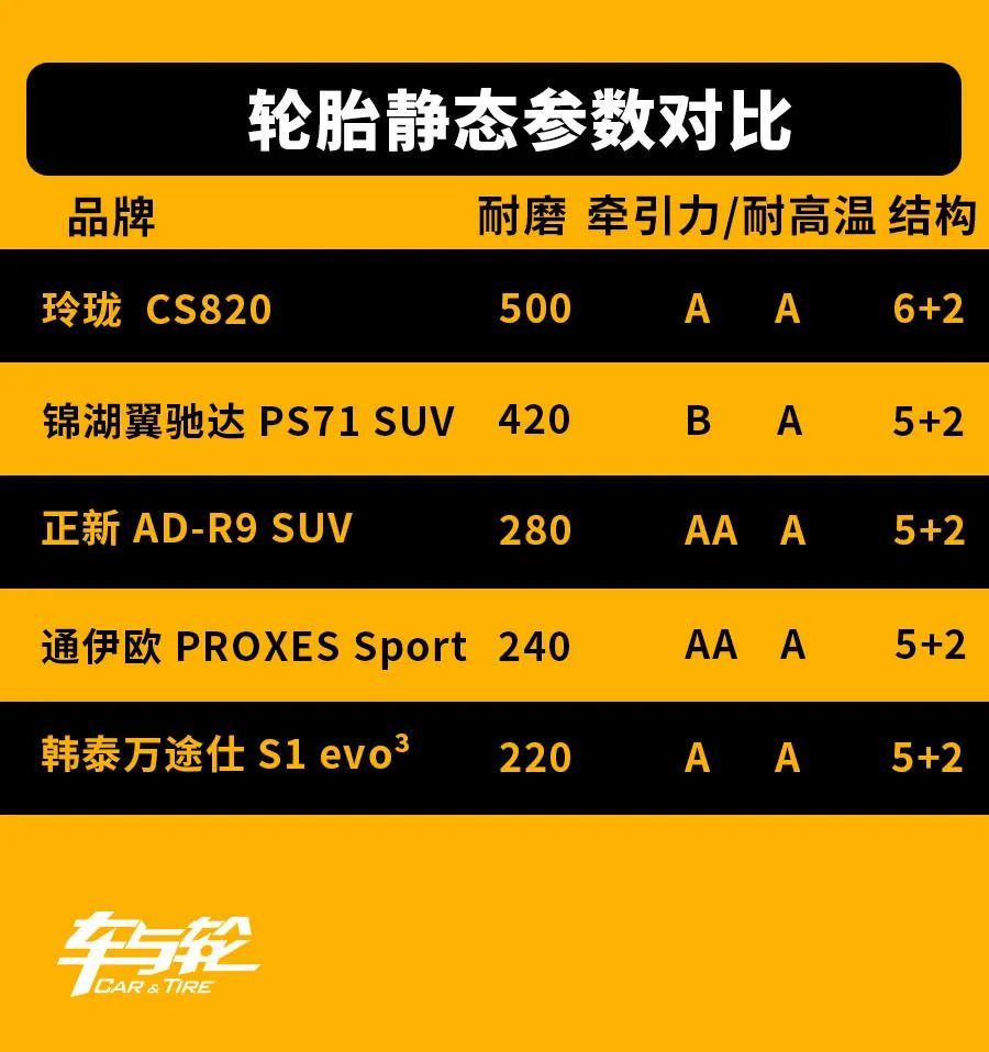 参与测试的产品分别是韩泰万途仕S1 evo³ SUV、锦湖翼驰达PS71 SUV、通伊欧PROXES Sports SUV、玲珑GRIP MASTER C/S (CS820),以及正新AD-R9 SUV。