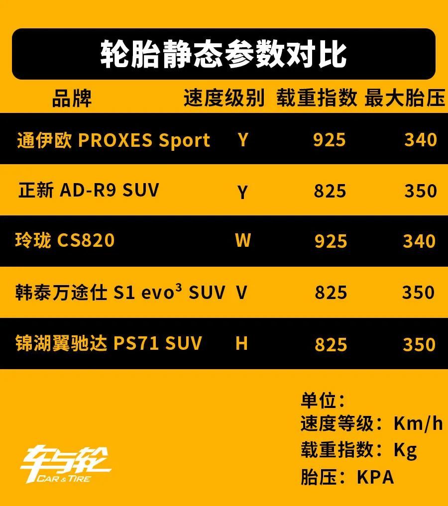 在5款同为235/55 R19规格的测试轮胎,速度级别为Y(最高时速300Km/h)的轮胎有2款,分别是通伊欧PROXES Sports SUV和正新AD-R9 SUV。玲珑CS820速度级别为W(最高时速270Km/h),韩泰万途仕S1 evo³ SUV速度级别为V(最高时速240Km/h),锦湖翼驰达PS71 SUV速度级别为H(最高时速210Km/h)。可见民族品牌在速度级别上占有优势,相同情况下应该优选速度级别更高的轮胎。