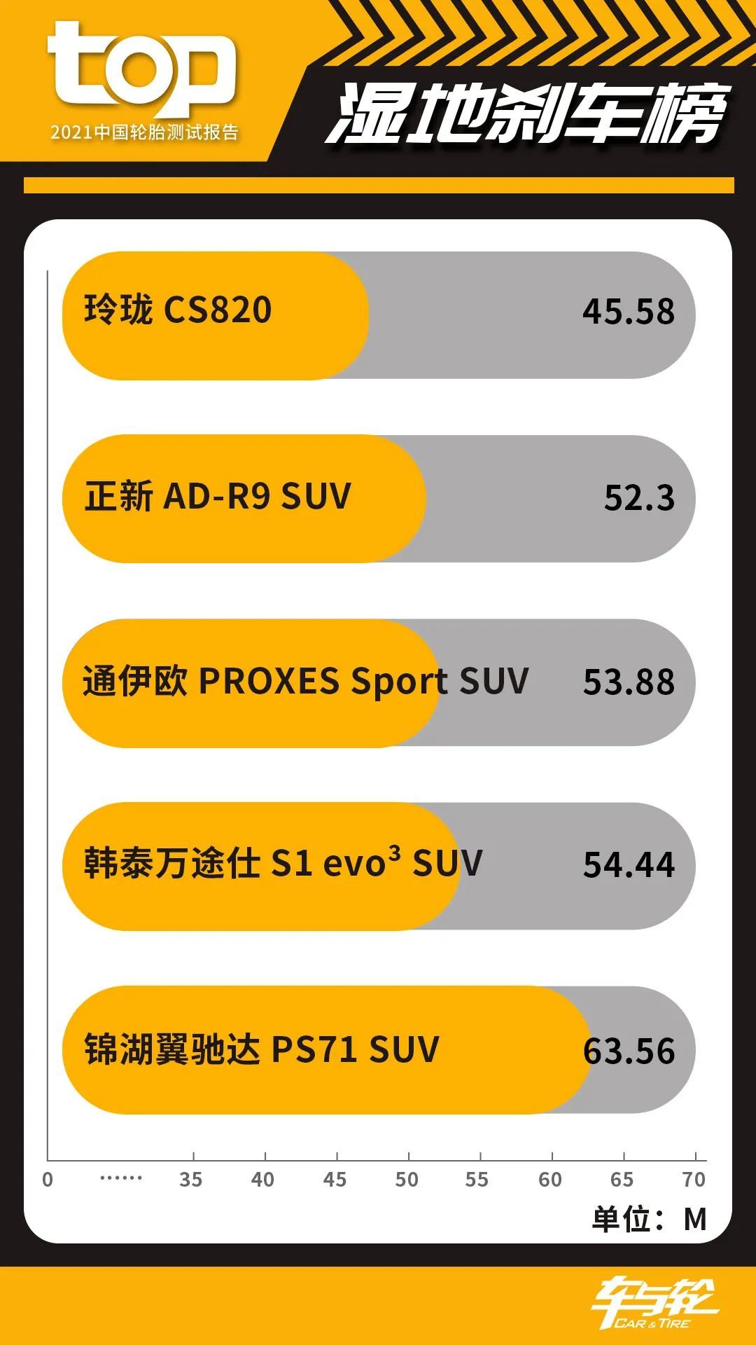 最终,玲珑CS820在湿地刹车环节以45.58米的成绩排名第一,也是5款轮胎中,唯一一款湿地刹车成绩进入50米内的产品!正新AD-R9 SUV以52.3米位列第二,通伊欧PROXES Sports SUV以53.88米排名第三。