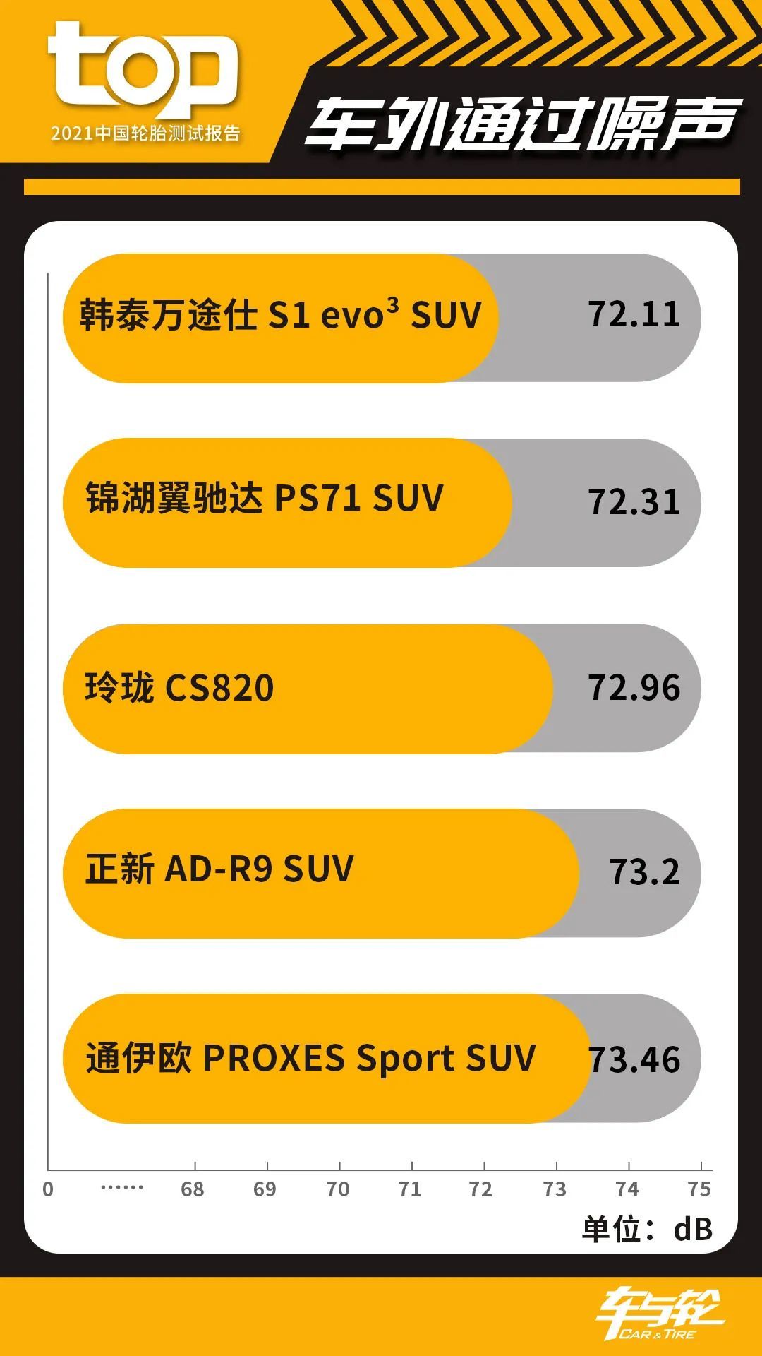 最终,韩泰万途仕 S1 evo³ SUV以72.11分贝的成绩排名第一,锦湖翼驰达PS71 SUV以72.31分贝位列第二,玲珑CS820以72.96分贝排名第三。正新AD-R9 SUV以73.2分别排名第四,通伊欧PROXES Sports SUV以73.46分贝排名第五。