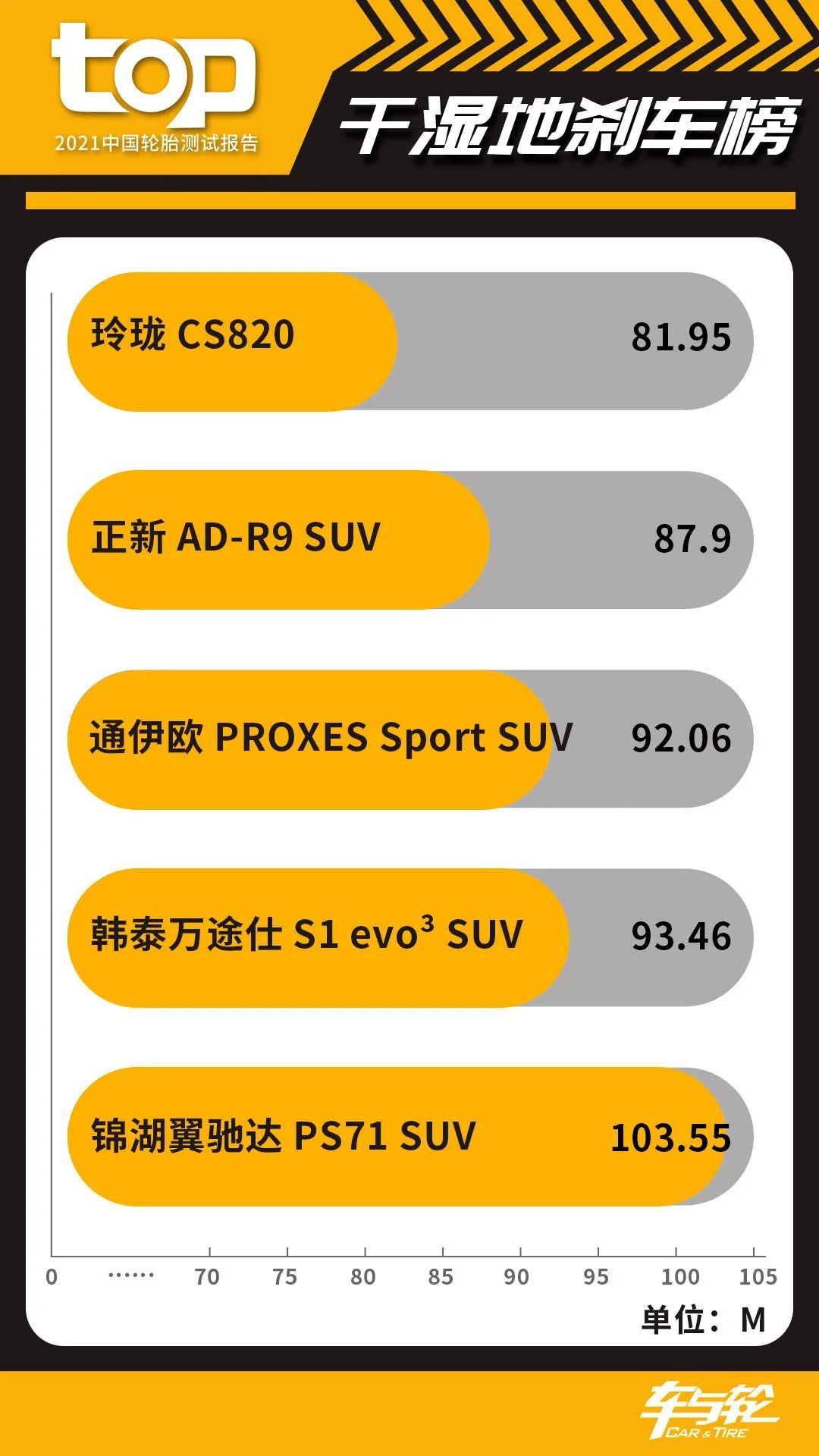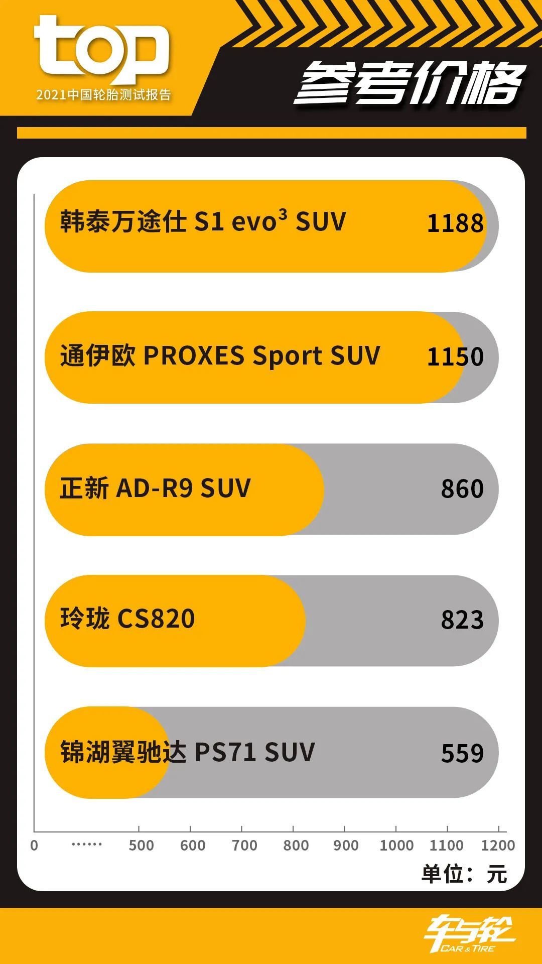 最终,韩泰万途仕 S1 evo³ SUV以5.89的系数排名第一,锦湖翼驰达PS71 SUV以6.73的系数位列第二,通伊欧PROXES Sports SUV以7.61的系数排名第三。