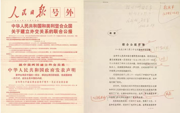 《人民日报》关于中美建交的号外及中国国家博物馆保存的“上海公报”草案底稿。