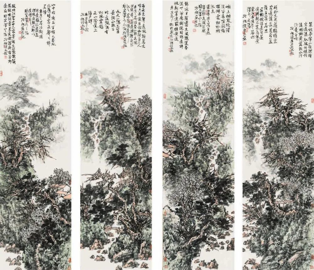 冷旭《春山聆泉图》中国画 180x48cmx4 辽宁