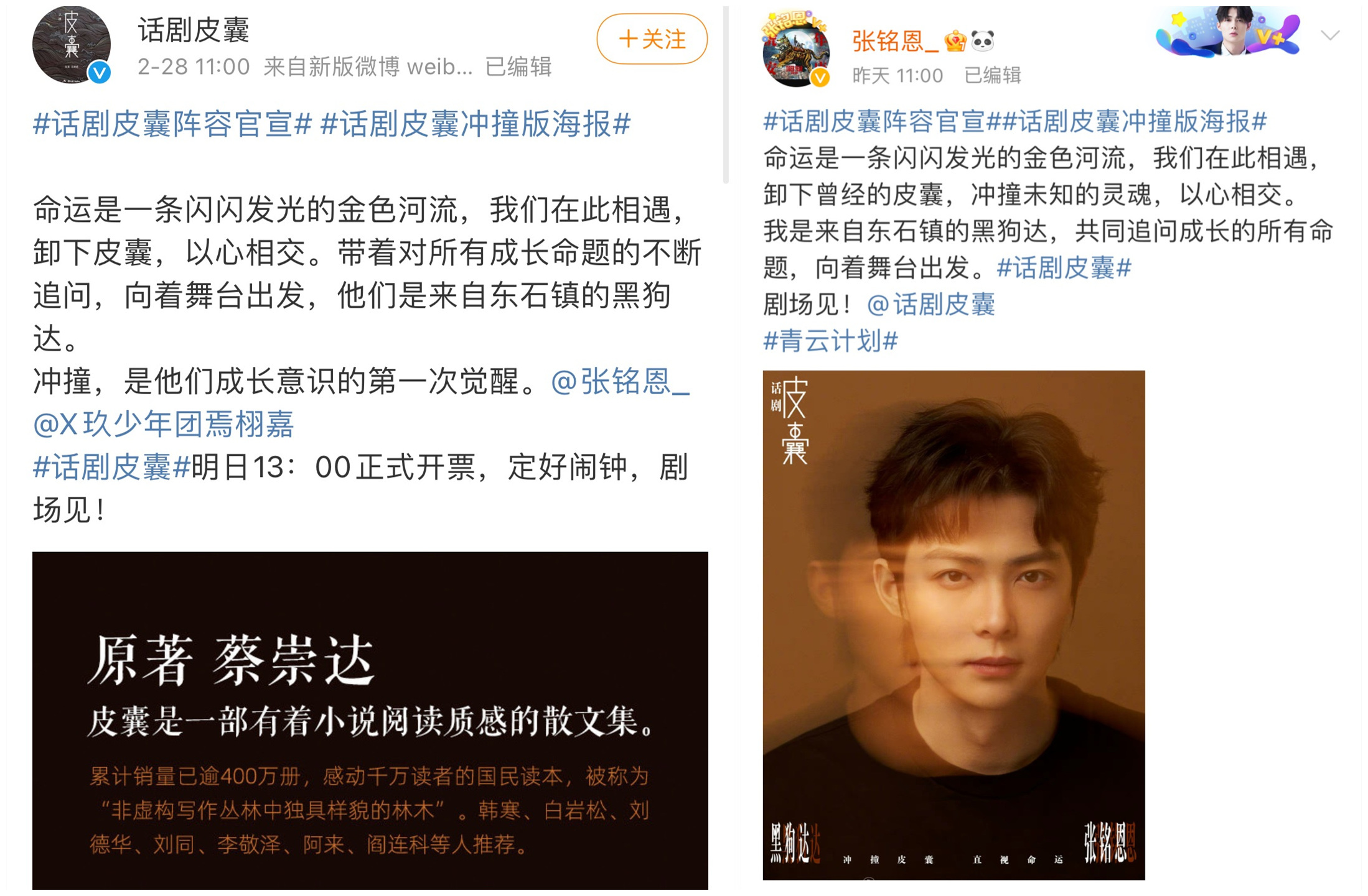 “命运是一条闪闪发光的金色河流,我们在此相遇,卸下曾经的皮囊,冲撞未知的灵魂,以心相交。”2月28日,话剧《皮囊》官方微博官宣此次话剧出演阵容。随后演员张铭恩微博发布一则关于话剧《皮囊》的微博内容,“我是来自东石镇的黑狗达,共同追问成长的所有命题,向着舞台出发。”引发各界关注讨论。