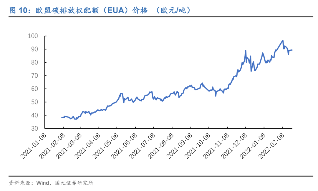 2015年《巴黎协定》设定了本世纪后半叶实现净零排放的目标。碳中和碳达峰的气候目标已经被越来越多的国家纳入国家发展战略。而碳排放权交易是基于市场机制控制温室气体排放的重要政策工具,多国将其作为双碳目标实现路径中的重要环节进行布局。欧洲地区作为能源改革的先锋,也是碳排放权交易与使用的排头兵,目前碳排放交易体系已经进入成熟阶段。去年以来,欧洲碳交易市场持续火热,欧盟碳排放权配额(European Union Allowance,EUA)价格上行趋势不改,一度直逼100欧元/吨;而美国2021年的碳排放社会参考成本定在51美元/吨。