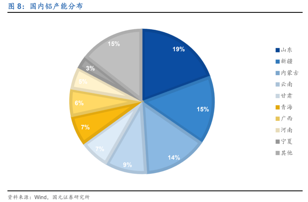 我国经过多年的实践和试点,去年在上海能源交易所正式启动了全国碳排放交易,目前碳价在50元/吨上下波动。可以看到,目前欧美成熟市场的碳交易价格是国内的十几倍。与此同时,加拿大、美国、欧洲等国纷纷加快了碳关税的进程。2021年7月以来,欧盟积极推进征收碳税,旨在调高进口钢铁、铝、水泥等电力产品价格,使欧盟企业与其他碳政策较弱国家的竞争对手处于平等地位,该政策预计2023年逐步实施,2026年全面达成。而铝的直接下游铝材约10%依赖出口,若欧盟、美国等国加征碳关税,势必导致产品成本的上升。从另外一方面讲,气候变化是全球命题,长期来看,各国碳市场交易随着资本市场的日趋开放在各国博弈的背景下预计将逐步趋同,国内碳价后续上涨空间仍然巨大。从行业上看,有色金属工业由能源消费带来的碳排放主要集中在铝(含氧化铝)、铜、铅锌、镁等产品的冶炼环节(约占81%),因此,碳成本后续对于铝企生产的影响无疑是十分显著的。