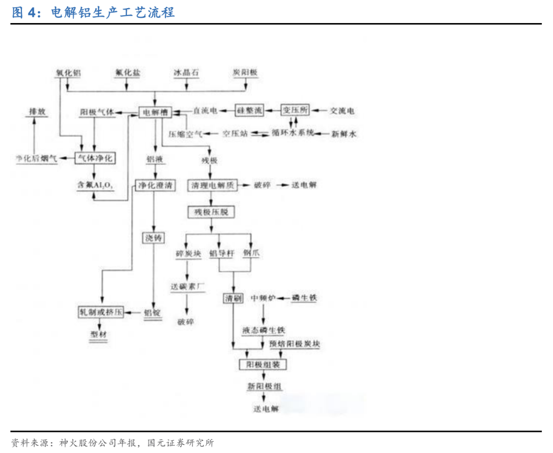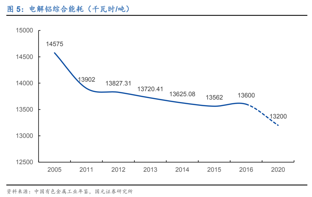 铝工业主要生产采用冰晶石—氧化铝融盐电解法。熔融冰晶石是溶剂,氧化铝作为溶质,以碳素体作为阳极,铝液作为阴极,在电解槽内的两极上进行电化学反应,最终生产出铝锭。电解铝行业能耗巨大,尽管综合能耗近年来有所降低,但每生产一吨电解铝仍需要约13200Kwh-13600Kwh电和1.9吨的氧化铝,而氧化铝的成本中电力也占据很大的比重。