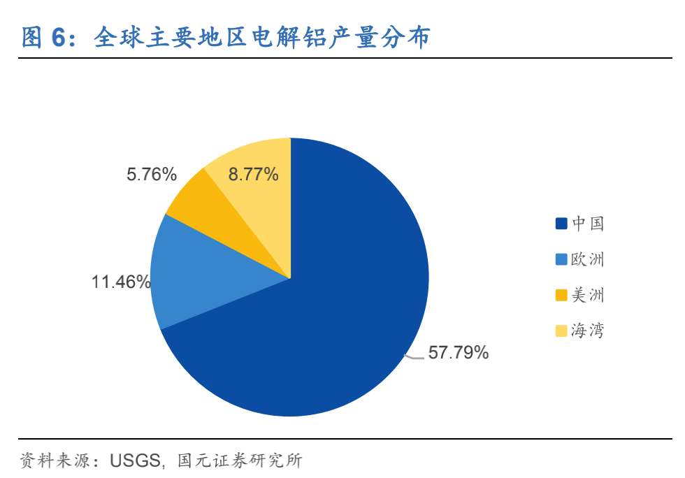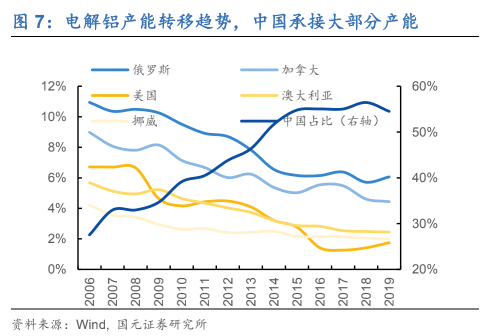 由于铝矿端资源并无稀缺性,行业主要竞争力在电力以及电力背后的能源成本。近20年国内承接海外电解铝产能转移,目前产能占全球产能58%。