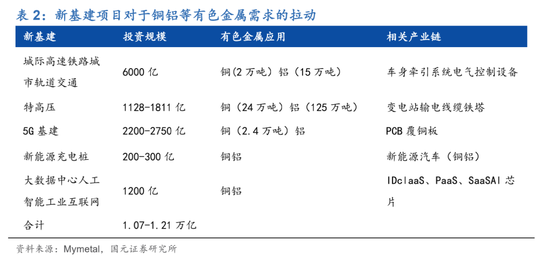 而新基建涵盖5G,特高压,新能源充电桩等七大领域,涉及产业众多,产业建设带动原材料市场需求同步上行。据Mymetal估计,新基建对铜铝等有色金属的依赖程度明显高于传统基建项目