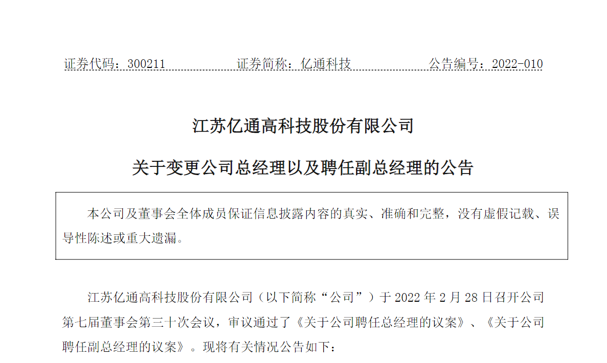 IT之家 3 月 1 日消息,亿通科技昨日发布公告,公司董事会于近日收到公司总经理王桂珍女士提交的书面辞职申请,因工作调整申请辞去公司总经理职务。公司董事长黄汪先生提名,经董事会提名委员会进行资格审核,公司董事会同意聘任孙鹏先生担任公司总经理,负责公司日常经营管理事务,任期自公司董事会审议通过之日起至第七届董事会届满之日止。