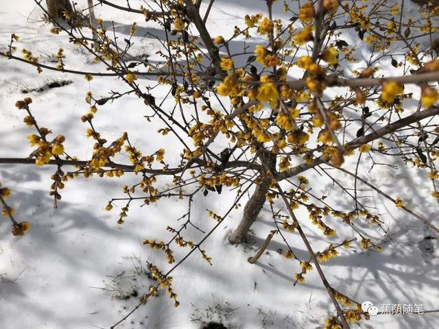 几棵梅树出现在路旁,有梅花开放。使我记起古人有踏雪寻梅之说,也油然想起了古人的诗来,这可谓之曰:踏雪觅诗了。