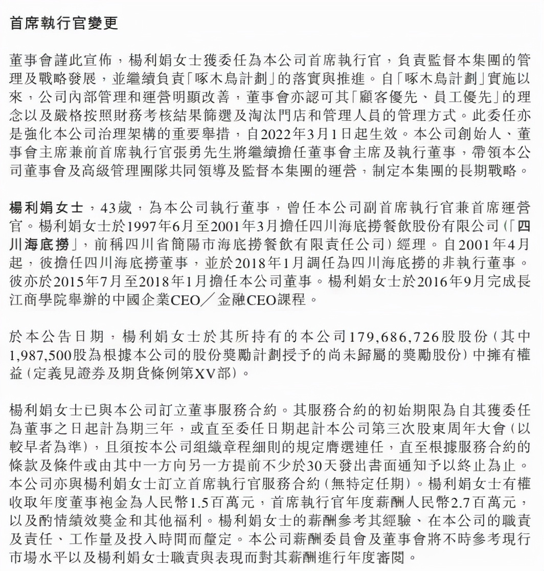 公告显示,从1997年起,杨利娟就开始担任四川海底捞餐饮股份有限公司(即海底捞国内的经营主体)经理,2001年4月起担任四川海底捞董事,并于2018年1月调任为四川海底捞的非执行董事。期间,杨利娟在2015年至2018年1月担任海底捞国际控股有限公司董事。