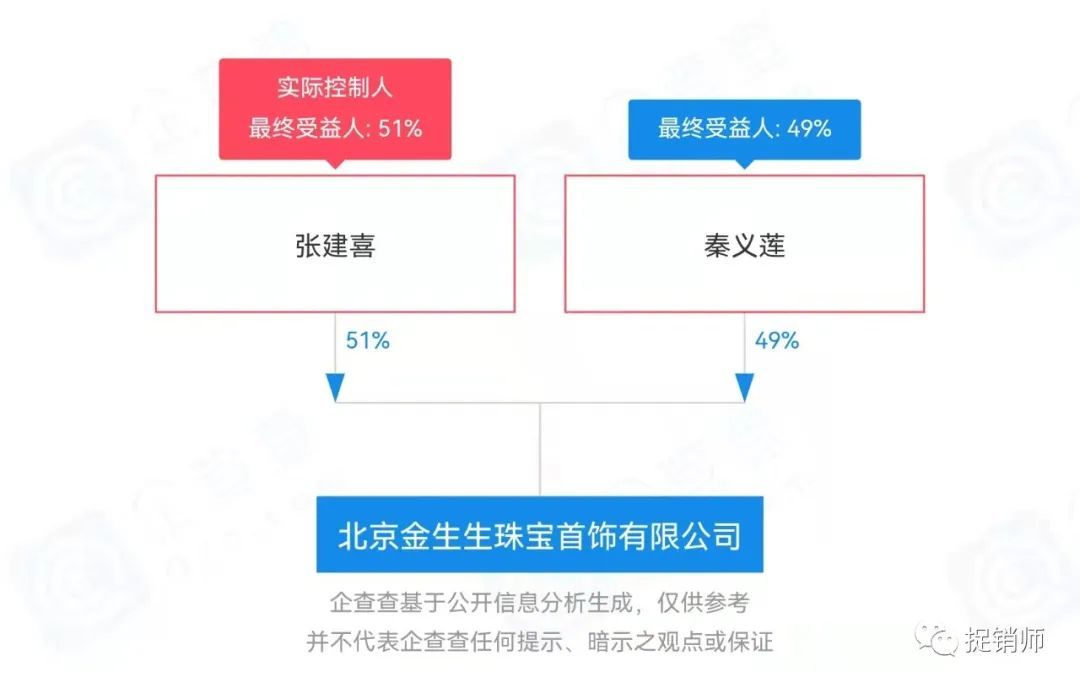 据企查查APP数据显示,北京金生生珠宝首饰有限公司成立于2021年6月4日,法人张建喜持股51%,秦义莲持股49%。