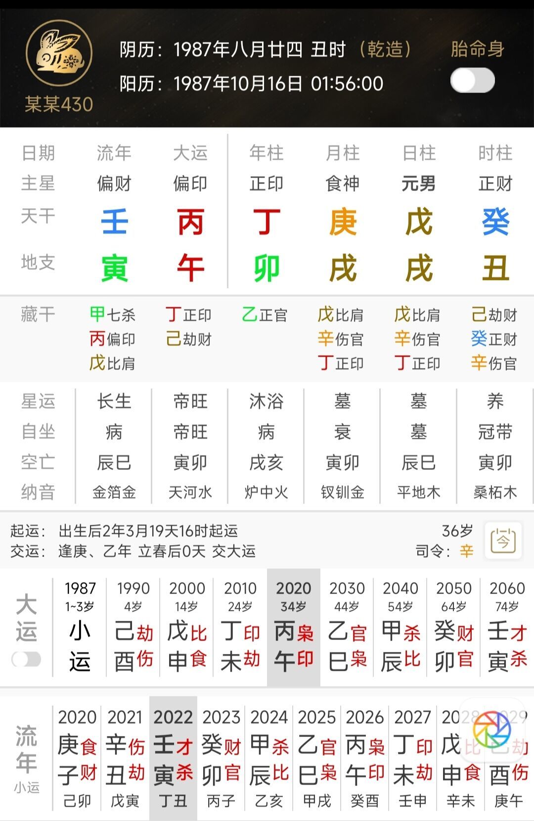 现在是丙午大运(2019到2029年),今年2022壬寅年!