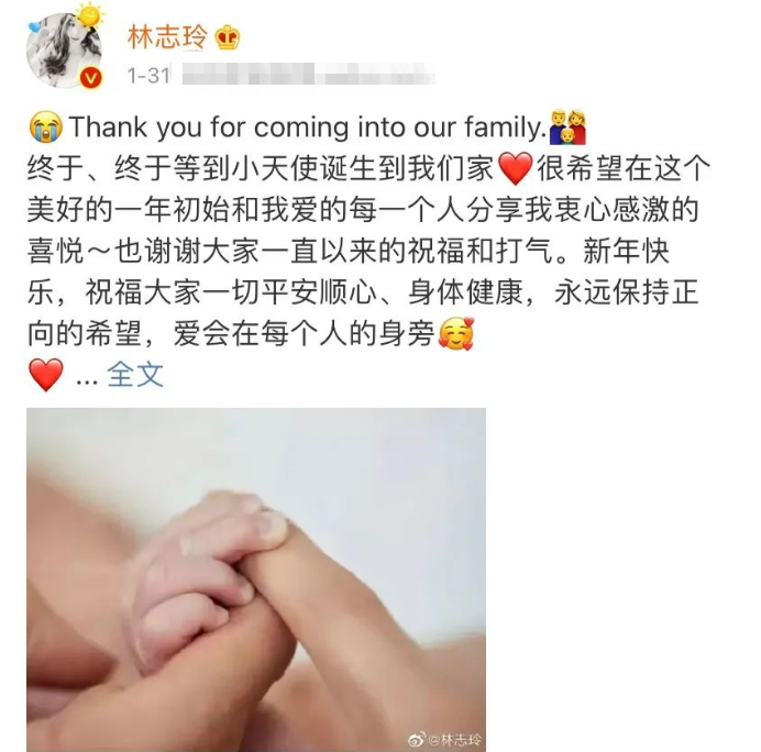 直到今年除夕,林志玲突然公布了自己平安产子的消息,此前志玲姐姐从没透露过一点消息,突然放出孩子的照片,真的惊讶到了不少人。