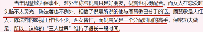 和周慧敏恋爱的同时,倪震又看上了新一届港姐陈法蓉,他跟陈法蓉说自己已经分手,又跟周慧敏说是陈法蓉勾引他,凭着一张嘴就把矛盾推给了两个女人,自己置身事外。