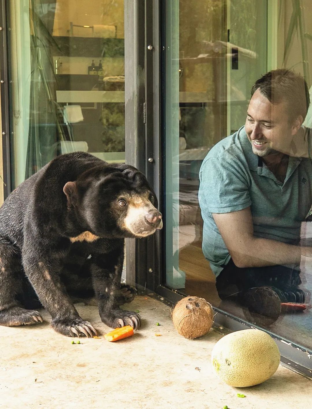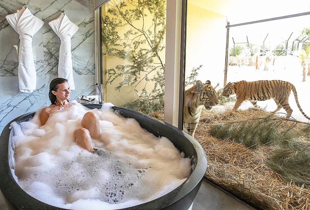 大部分客房内,客人与猛兽之间只有一层玻璃相隔,不仅可以与雄狮共进晚餐,和棕熊一起看电视,还能在猛虎的注视下沐浴,甚至从卧室阳台喂长颈鹿。