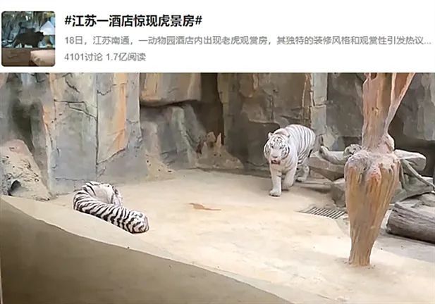 年初,江苏省南通市森迪部落树屋酒店隔着一层透明玻璃可以清楚观察老虎一举一动的客房迅速出圈并引发热议,抖音相关话题播放量破千万,还登上了微博热搜。