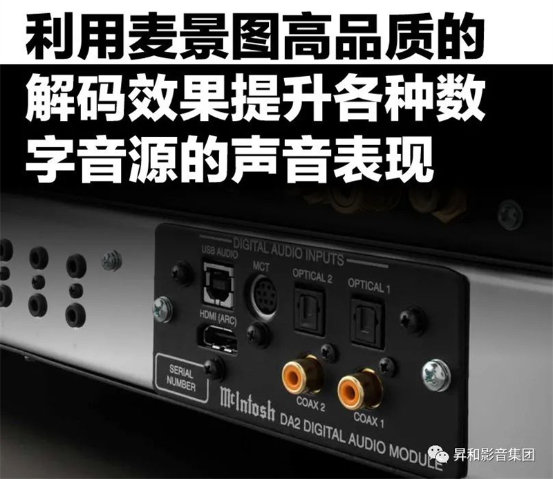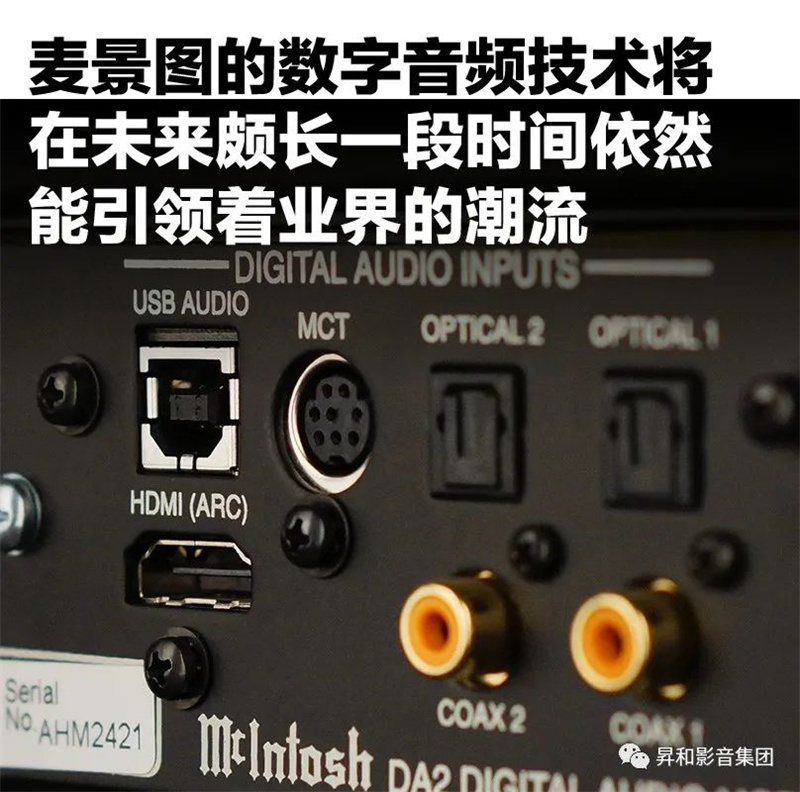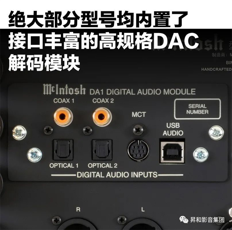 McIntosh麦景图合并功放和前级内置的高格式音频解码模块具先进的技术,支持包括独家MCT端子、USB、同轴、光纤,甚至HDMI在内的多组数字音频输入接口,最高可对应32Bit/384kHz和DSD512的数字音频规格,意味着McIntosh麦景图的数字音频技术将在未来颇长一段时间依然能引领着业界的潮流。并且,在产品规划阶段就预留了可持续升级的设计,其内置的DAC模块为可更换式设计,以备以后有新技术新格式需更新时,无需更换功放/前级整机即可选择通过更新组件的形式升级,从一个侧面印证了McIntosh麦景图追求最大投资价值的产品理念。