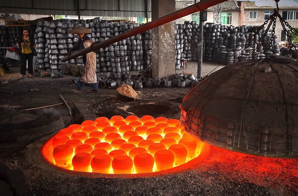 砂锅烧制有专用的砂锅灶。砂锅灶为泥坯砌垒盘制,上方有三个并排的炉灶;炉灶底有灶眼连通下面的灶洞,灶洞贯通窑侧的土风匣。工人手拉风匣鼓风,充分燃烧灶内的煤炭。如今由于时代的进步,手拉的风匣早已经变为电动的鼓风机了;炉工放入灶沿上摆放的砂锅坯子,盖上陶锅焖烧。经多次翻烧、出炉、撒焦炭、入暗锅上釉等多重工序后才最终成器。为使砂锅不会烧裂,艺人对制作工艺的要求非常高,如一般要达到五合土“手捻如面、入口不碜”,即便是含在口中咀嚼也感觉不到碜牙;有的手艺人刚制出的泥坯,甚至能够达到“细腻润滑、河中取水”的程度。