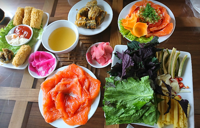 木洲以鲑鱼闻名菜有炸三文鱼皮、三文鱼刺身、三文鱼粥、三文鱼火锅、锡箔烤三文鱼和炸三文鱼等6道菜,每道菜都有不同的口味,每一种口味都是令人无法抗拒的美味。