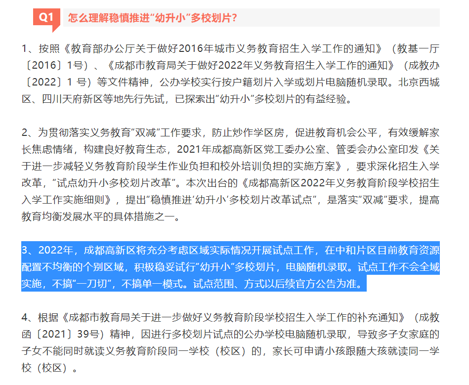 而其它区域的也别觉得没到自己头上就能开心保持优势。虽然说主城区的“多校划片”目前仍未有具体时间表,但稍微关注学区的明显能发现成都政府在该方面的动手频率越来越高了:
