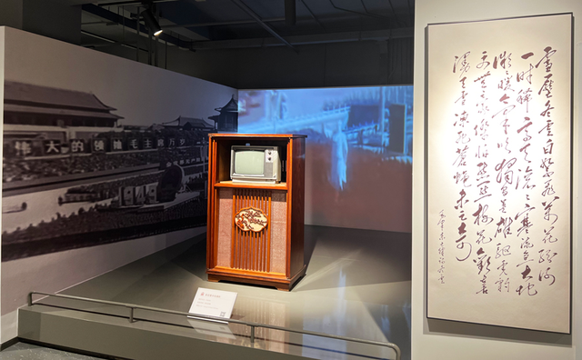 围绕这件作品布置有老照片,珍贵的历史影像,右侧墙上还有一幅书法作品,是毛主席的诗:雪压冬云白絮飞,万花纷谢一时稀。高天滚滚寒流急,大地微微暖气吹。独有英雄驱虎豹,更无豪杰怕熊罴。梅花欢喜漫天雪,冻死苍蝇未足奇。这首诗通过对梅花无惧风雪严寒形象的描写,表明中国共产党人和中国人民,不会被艰难困苦击倒,只会迎难而上,更加意气风发、斗志昂扬。刘更生说:“这首诗展现了以毛主席为表率的中国共产党人革命浪漫主义的壮美情怀。我们要将这样的革命情怀、红色文化,传承给现在的青少年,让他们更加爱国爱党,争做红色接班人。这一个红色教育基地部分我们还会继续精雕细琢,认真打造。”