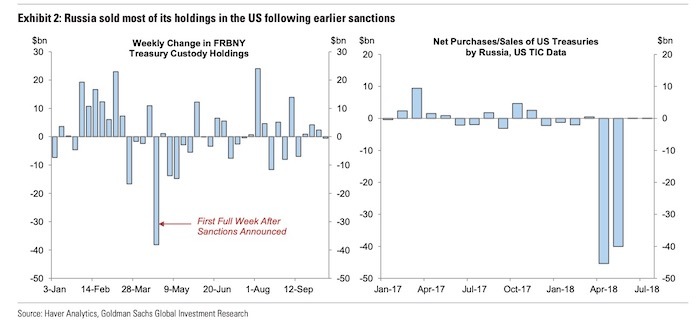 据高盛研究,就地理位置而言,俄央行大部分货币(非黄金)储备在中国(18%)、法国(16%)、日本(13%)和德国(12%)。尽管确切位置难料,但根据俄央行和其他国际消息来源的披露,资金可能从纽约联储的托管账户转移到了欧洲、中国和日本。例如,2018年的春天,俄央行显著减少在纽约联邦储备银行托管的资产。当时的俄央行报告称,其对美国的地理敞口(定义为“按交易对手或证券发行者的居住地分列”)大幅下降。