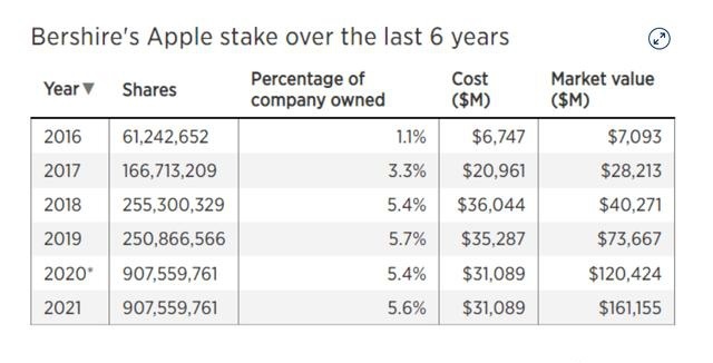 苹果公司的股票回购策略,还允许其股票持有人所投资的每一美元对应的企业盈利都有所增加。尽管伯克希尔已经部分减持了苹果股票,但其对苹果的持股比例仍从2020年底的占比5.27%攀升至去年年底的5.43%。多年来,伯克希尔还从这家科技巨头那里获得了定期股息,平均每年约7.75亿美元。