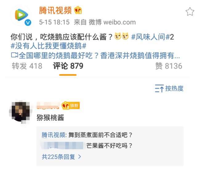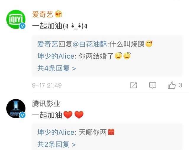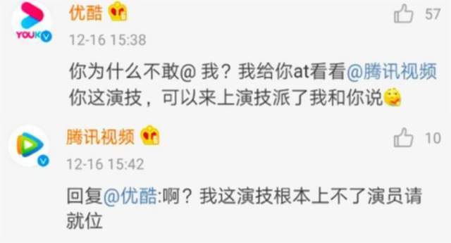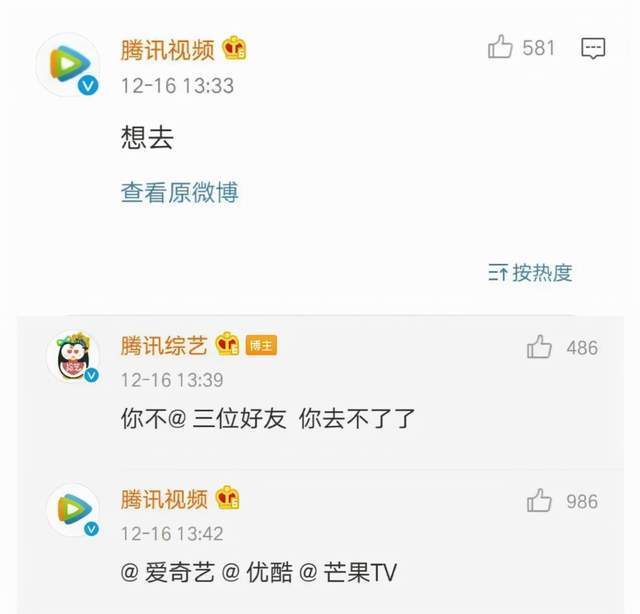 比如说某次,腾讯综艺在微博抽门票,腾讯视频则跑去评论区表示“想去”。腾讯综艺回复称“你得艾特三个好友”。于是,腾讯视频就艾特了爱奇艺、优酷和芒果TV。
