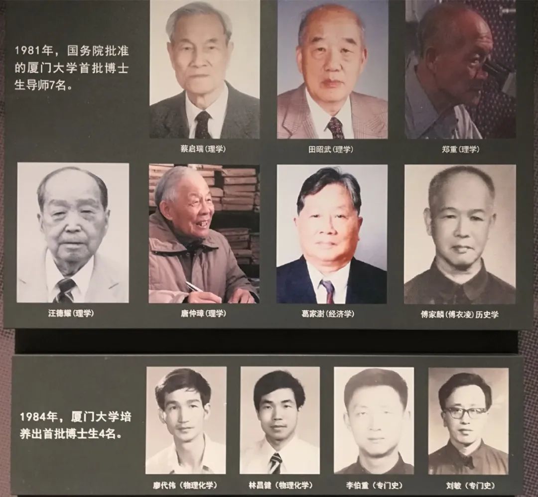 我校是首批博士和硕士学位授予单位,经国务院学位委员会第三次会议(1981年10月8日)、第五次会议(1983年12月5日)和第七次会议( 1986年7月28日)批准,全校共有会计学、财政学、政治经济学、统计学、货币银行学、中国古代史、专门史(经济史)、专门史(中外关系史)、汉语史、国际经济法、高等教育学、半导体物理与半导体器件物理、物理化学、分析化学、植物学、动物学、海洋化学、海洋生物学等18个博士点,蔡启瑞、唐仲璋、傅家麟、郑重、汪德耀、葛家澍、田昭武、张乾二、周绍民、韩国磐、金德祥、余绪缨、韩振华、邓子基、钱伯海、李法西、吴宣恭、黄良文、洪文金、黄典诚、潘懋元、陈安、杨国桢、吴伯僖、林祖庚、黄本立、林鹏、林宇光、唐崇惕、丘书院等30位博士生导师,还有2位外单位、1位外籍兼职博导。硕士学位授权点50个。1986年4月,经国务院批准,我校开始试办厦门大学研究生院。至1987年秋申报重点学科时,共招收博士研究生96名(已毕业并取得博士学位的12名),硕士研究生1442名(已毕业并取得硕士学位的600名),研究生班研究生110名。我校在学科建设、研究生培养、学术环境、工作条件等各方面,都具备了申报重点学科的条件,便开始积极组织第一、二批博士点参加文、理科重点学科的申报,最终有8个博士点通过通讯评议。