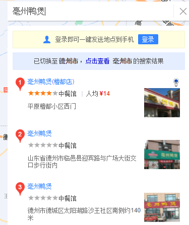 甚至你在亳州市搜索“亳州鸭煲”,懂事的地图也会自动跳转到山东德州的辖区。