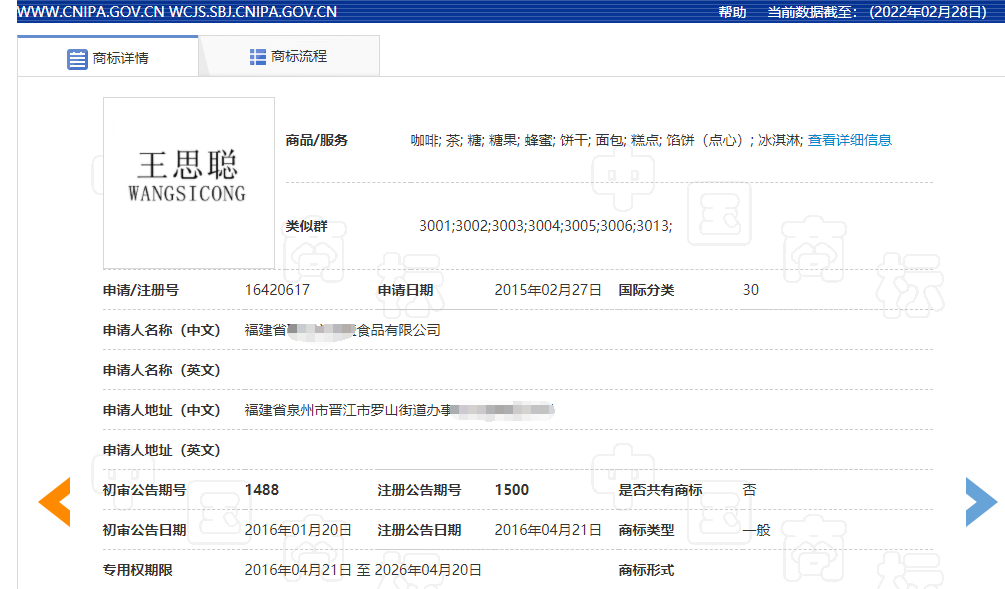 从上图我们可以直观地看到该商标是由福建省某公司注册的,商标注册证上清晰的显示商标名称为“王思聪”,根据商标局查询,小编找到了这枚商标,2016年4月21日核准注册,使用在第30类商品上。