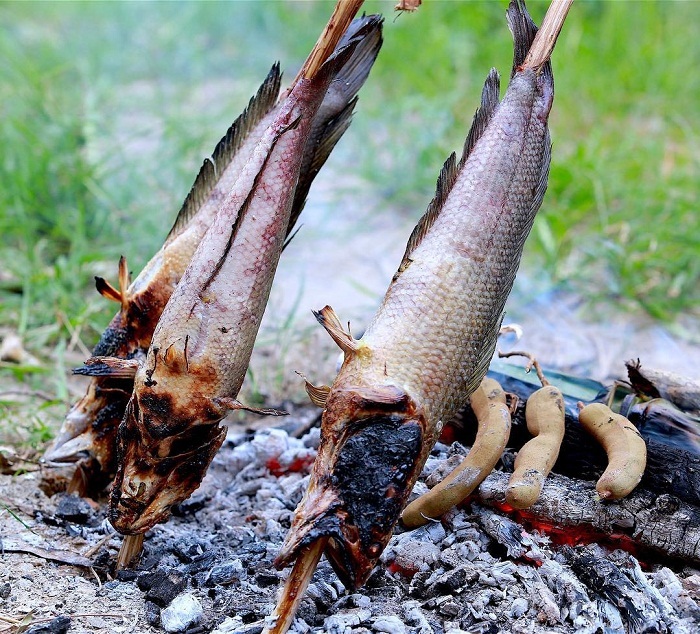 然后把这条窜好鱼放在地上,用一定量的干稻草盖住鱼,然后点燃稻草。听上去很简单,但不是每个人都能做到,有些时候稻草烧完鱼还没有熟,有些时候稻草烧完鱼也成碳了,用的稻草量一定要把握好。